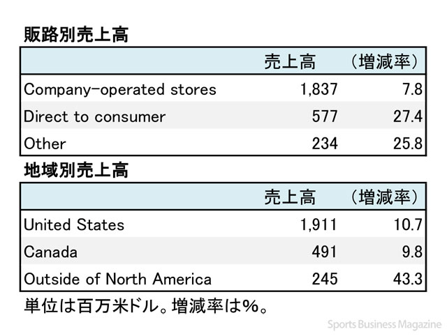 直営店は北米地域が270店(24増)と大半を占めている。カナダが57店(6増)で2番手。「Australia」(豪州)が28店(1増)である。日本は2店舖の展開だ。販路別の売上高は、「Company-operated stores」(直営店)が18億3,700万米ドル(約2,002億3,300万円、同)、7.8%増と主力になっている。スポーツ各社が力を入れている「Direct to consumer」(DTC)も5億7,700万米ドル(約628億9,300万円、同)、27.4%増と順調に伸びている(表2を参照)。