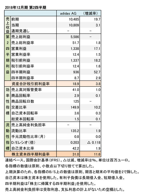 adidas(アディダス社)の2018年12月期 第2四半期(1-6月)連結決算は、主力の欧米・アジア地域が好調に推移したことで、増収・増益を達成した。ラテン・アメリカ、ロシアの他の地域は苦戦した。