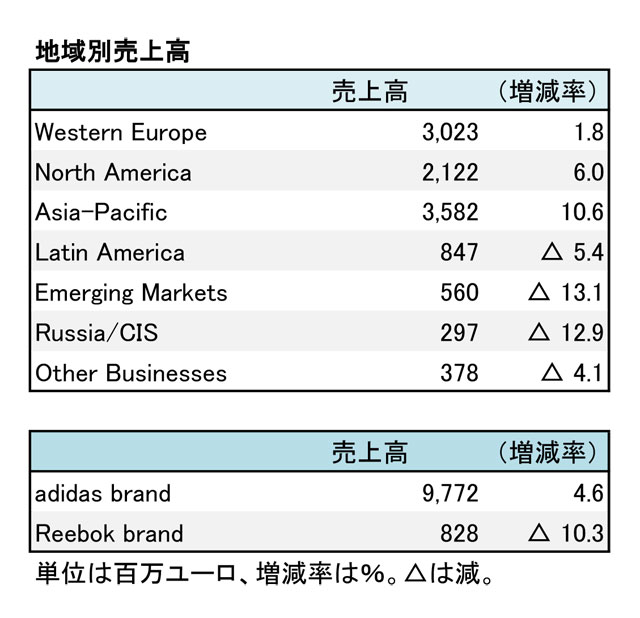 最も伸び率が大きかったのは「Asia-Pacific」(アジア・太平洋)地域。売上高は35億8,200万ユーロ(約4,620億7,800万円、同)、10.6%増と好調な推移だった。ブランド別では「adidas」ブランドが97億7,200万ユーロ(約1兆2,605億8,800万円、同)、4.6%増と堅調な推移だった。
