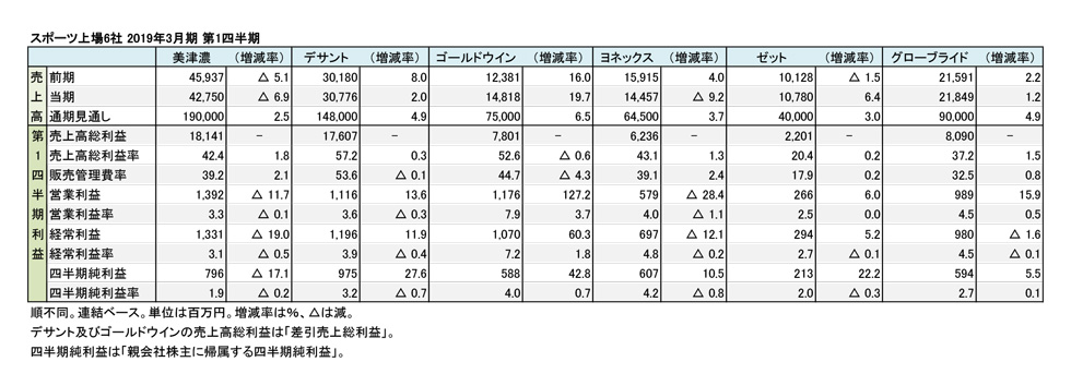 主要スポーツ上場6社の2019年3月期第1四半期(4-6月)では、増収基調の企業が半数を占めた。利益面では増益と減益が半分に分かれた。決算上の区切りで、春夏商戦は第2四半期も続いているため、途中経過の数値として参考にされたい。