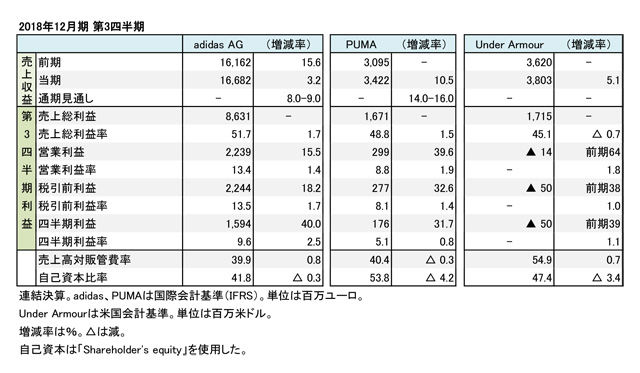 主要外資系スポーツ企業3社(アディダス、プーマ、アンダーアーマー)の2018年12月期第3四半期連結決算をまとめた。対象はアディダス、プーマ、アンダーアーマーの3社で、いずれも1-9月の9カ月間の第3四半期。アディダス、プーマが増収・増益と健闘したが、アンダーアーマーが損失を計上して苦戦した。