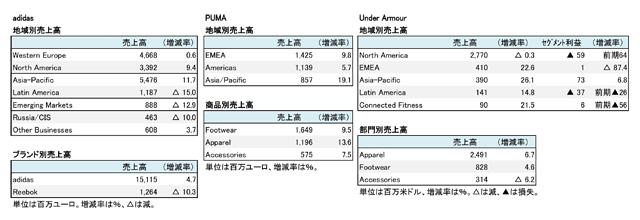 全地域で増収を達成した。中でも、主力の「EMEA」(欧州・中東・アフリカ)が売上収益14億2,500万ユーロ(約1,866億7,500万円、同)、9.8%増と引き続き、けん引役になった。商品別では、「Apparel」(アパレル)が同11億9,600万ユーロ(約1,566億7,600万円、同)、13.6%増(同19.7%増)と好調だった。
