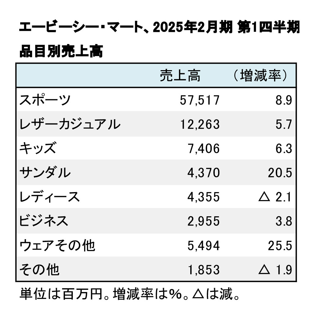 エービーシー・マートの2025年2月期 第1四半期(3-5月)の連結決算は、主力カテゴリーが堅調で、増収増益を達成した。引き続き「スポーツ」がけん引役になったほか、「サンダル」が2ケタ増と健闘した。