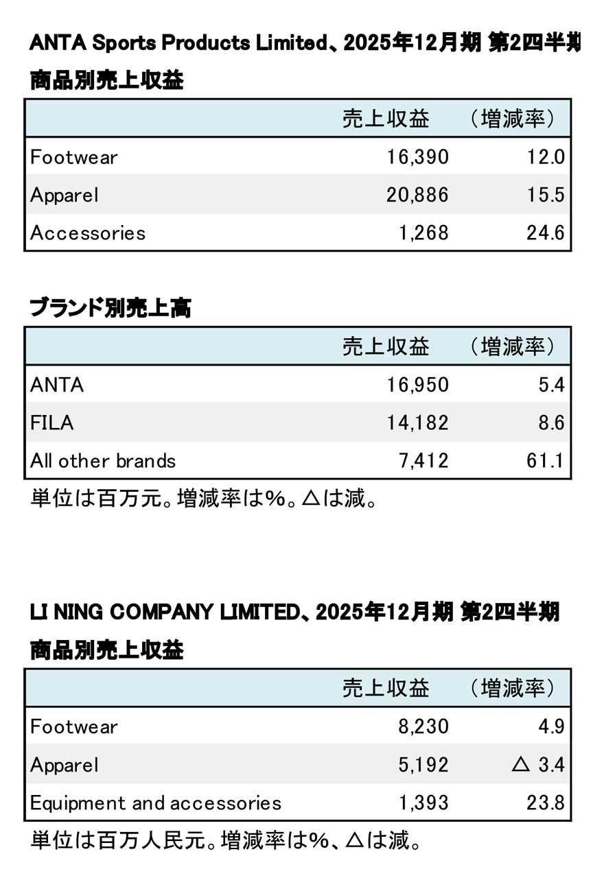 中華系スポーツ企業2社の2025年12月期 第2四半期をまとめた。対象としたのは、ANTA Sports Products Limited(安踏體育用品有限公司=アンタ スポーツ プロダクツ社)、LI NING COMPANY LIMITED(リーニン社=李寧有限公司)。増収するも、利益の伸びが鈍化した。