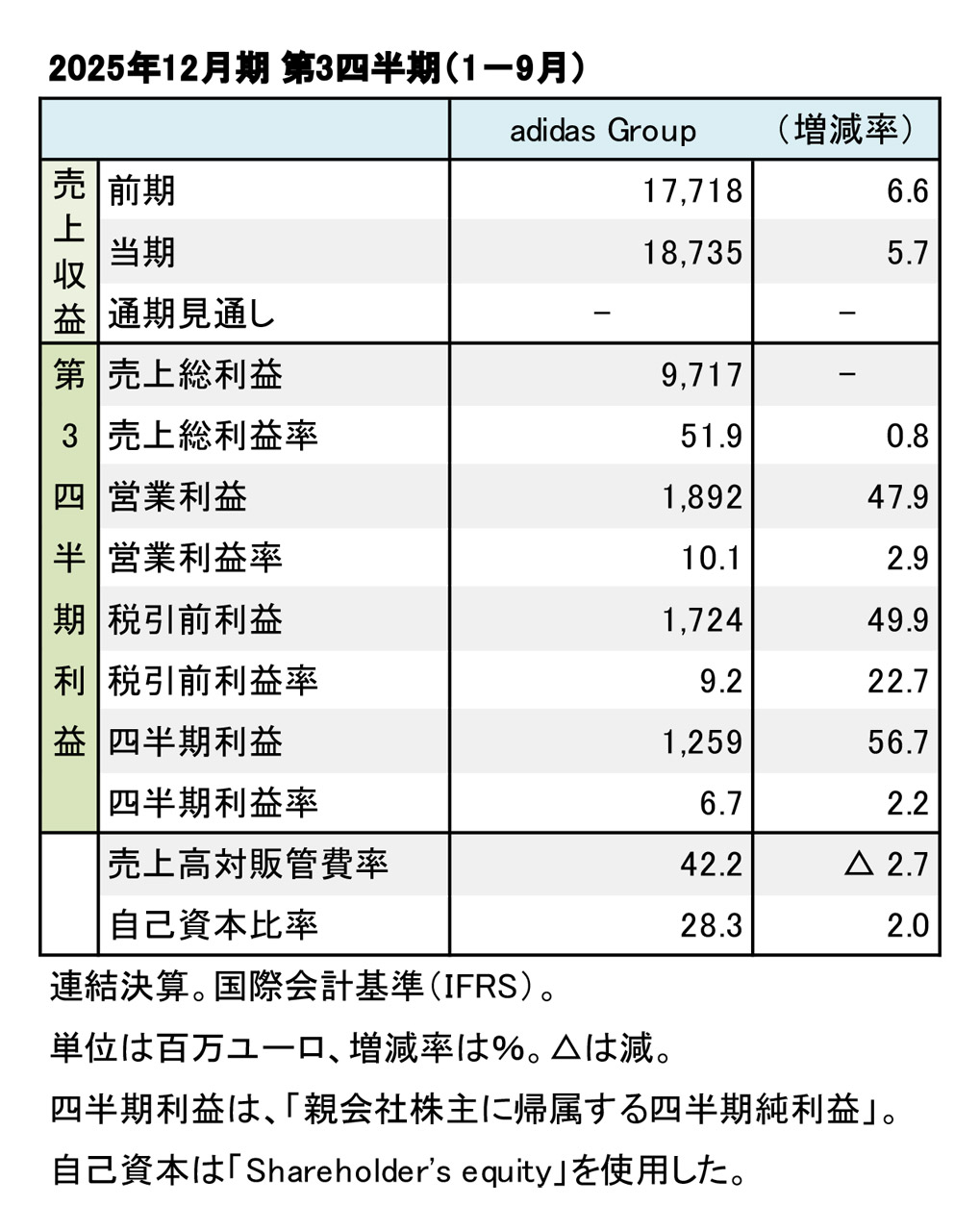 adidas Group(アディダス社)の2025年12月期第3四半期の連結決算は、欧米やアジア地域などが健闘し、増収増益を達成した。「Europe」(欧州)と「Footwear」(シューズ)がけん引役になった。「Japan/South Korea」(日本、韓国)も健闘した。