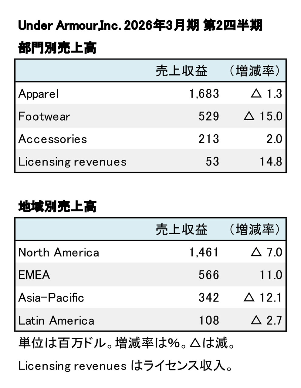 Under Armour,Inc.(アンダーアーマー社)の2026年3月期第2四半期(4-9月)の連結決算は減収するも、前年同期の損失計上から黒字転換を果たした。主力の「North America」(北米)、「Apparel」(アパレル)が苦戦した。「Footwear」(フットウエア)は2ケタの減収となった。