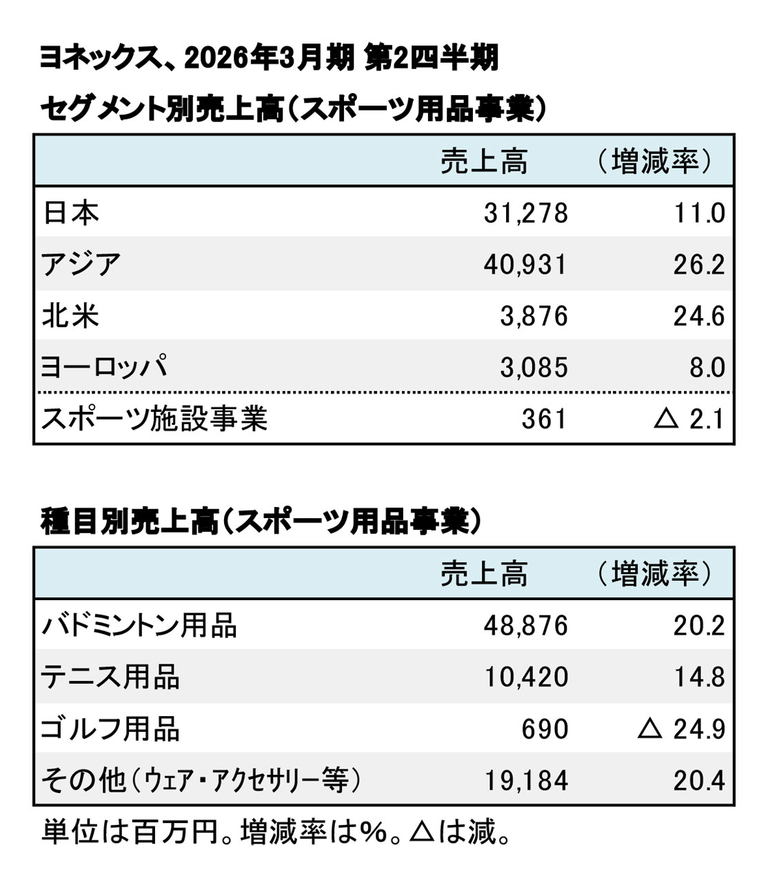 ヨネックスの2026年3月期第2四半期(4-9月)の連結決算は、主力の「バドミントン」がけん引役となり、2ケタの増収増益を達成した。地域別では「アジア」が2ケタ増と好調に推移した。