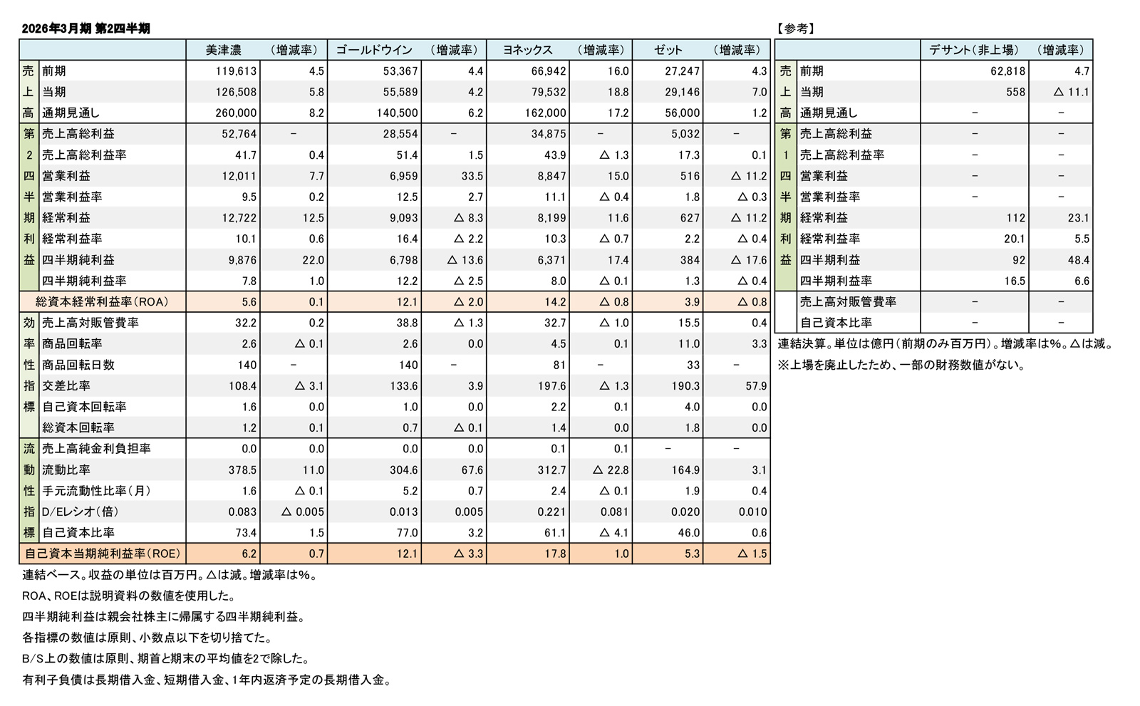 対象にしたのは美津濃(ミズノ)、ゴールドウイン、ヨネックス、ゼットの4社(順不同)。いずれも9月末に第2四半期を迎えた企業だ。全社が増収を達成、2社が増益となった。上場を廃止したデサントは減収増益となった。