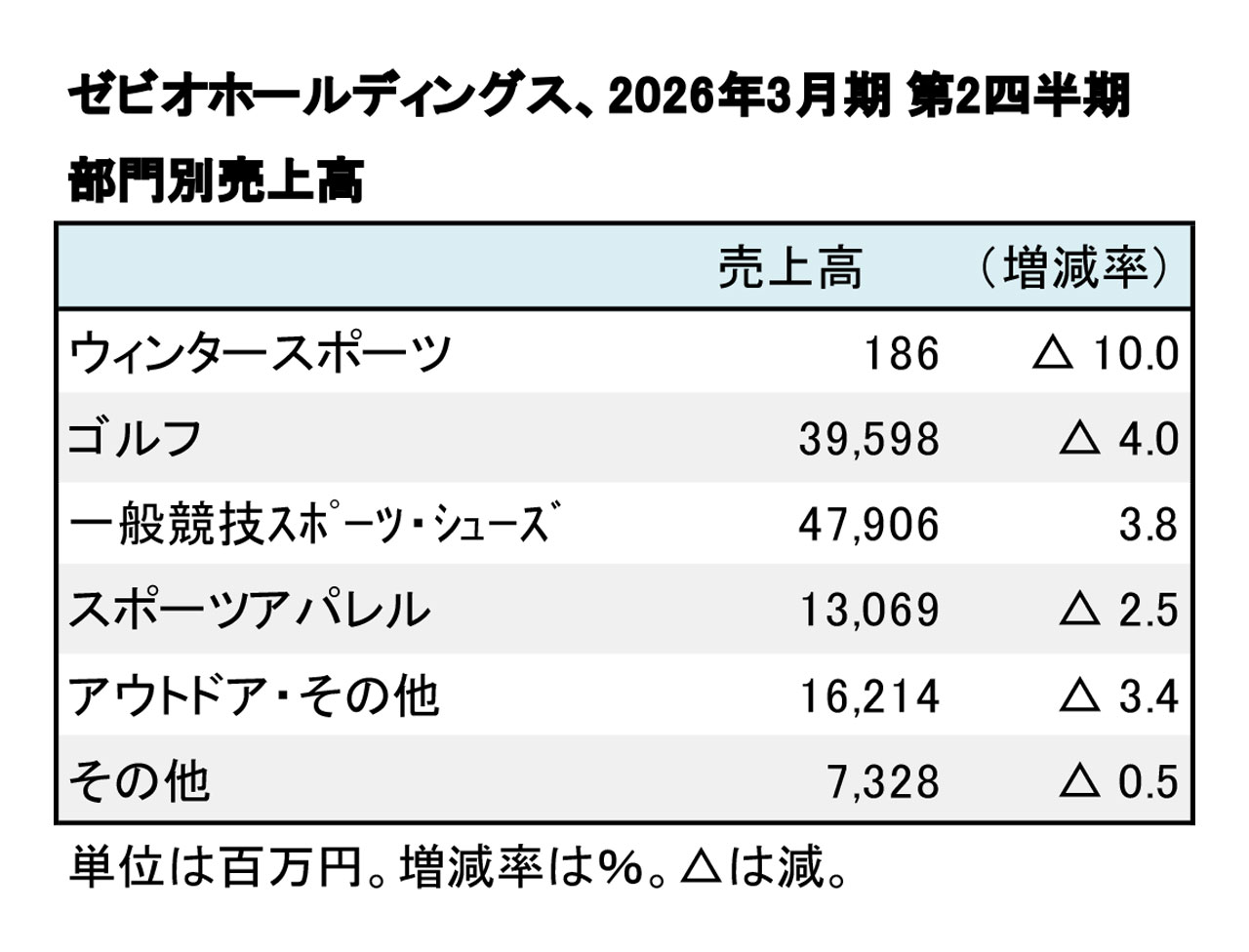 ゼビオホールディングスの2026年3月期 第2四半期(4-9月)連結決算は、微減収減益となった。主力の「一般競技スポーツ・シューズ」は健闘したが、「ゴルフ」「アウトドア・その他」などが伸び悩んだ。残暑の影響もあり、売り上げが伸び悩んだ。