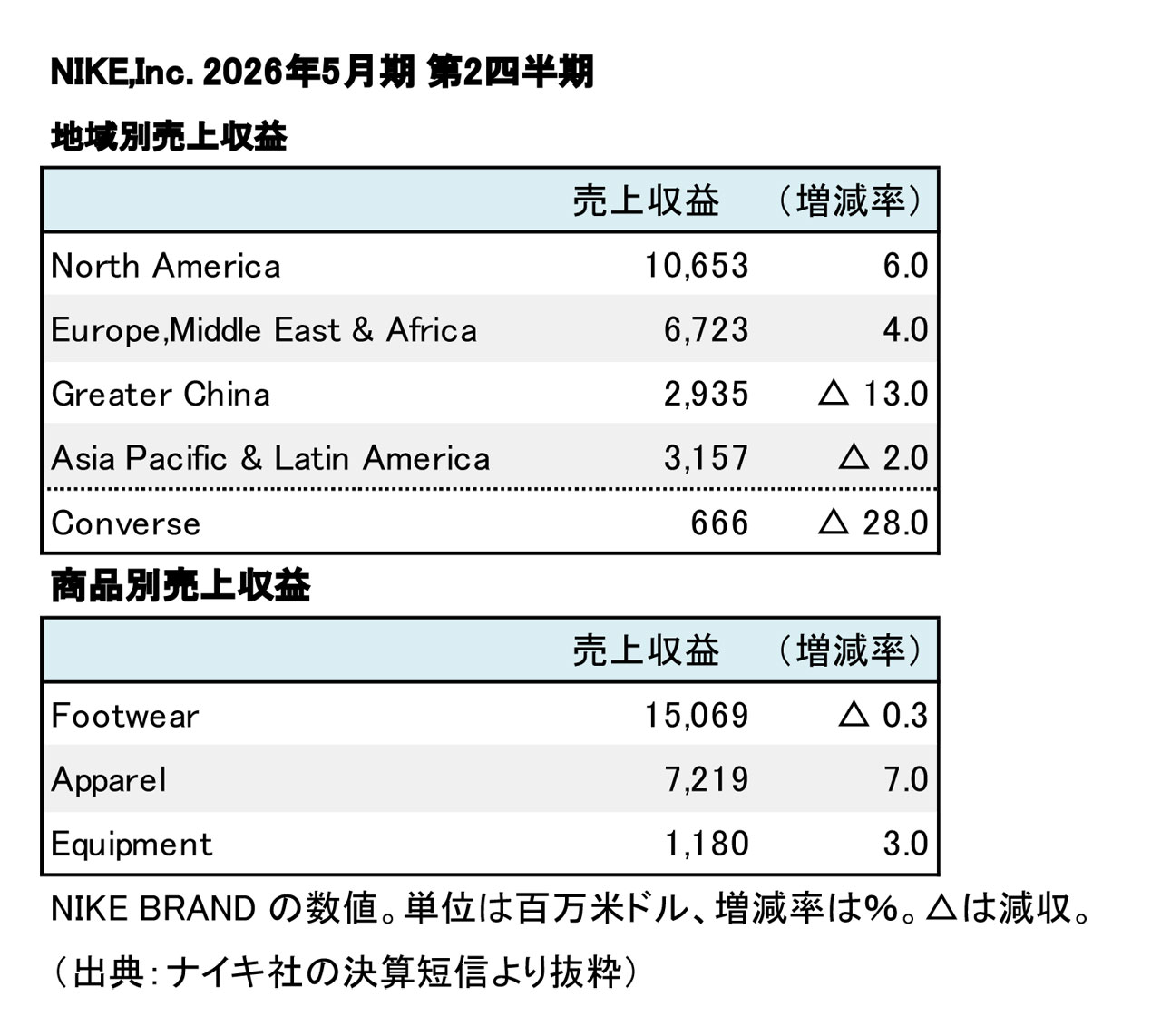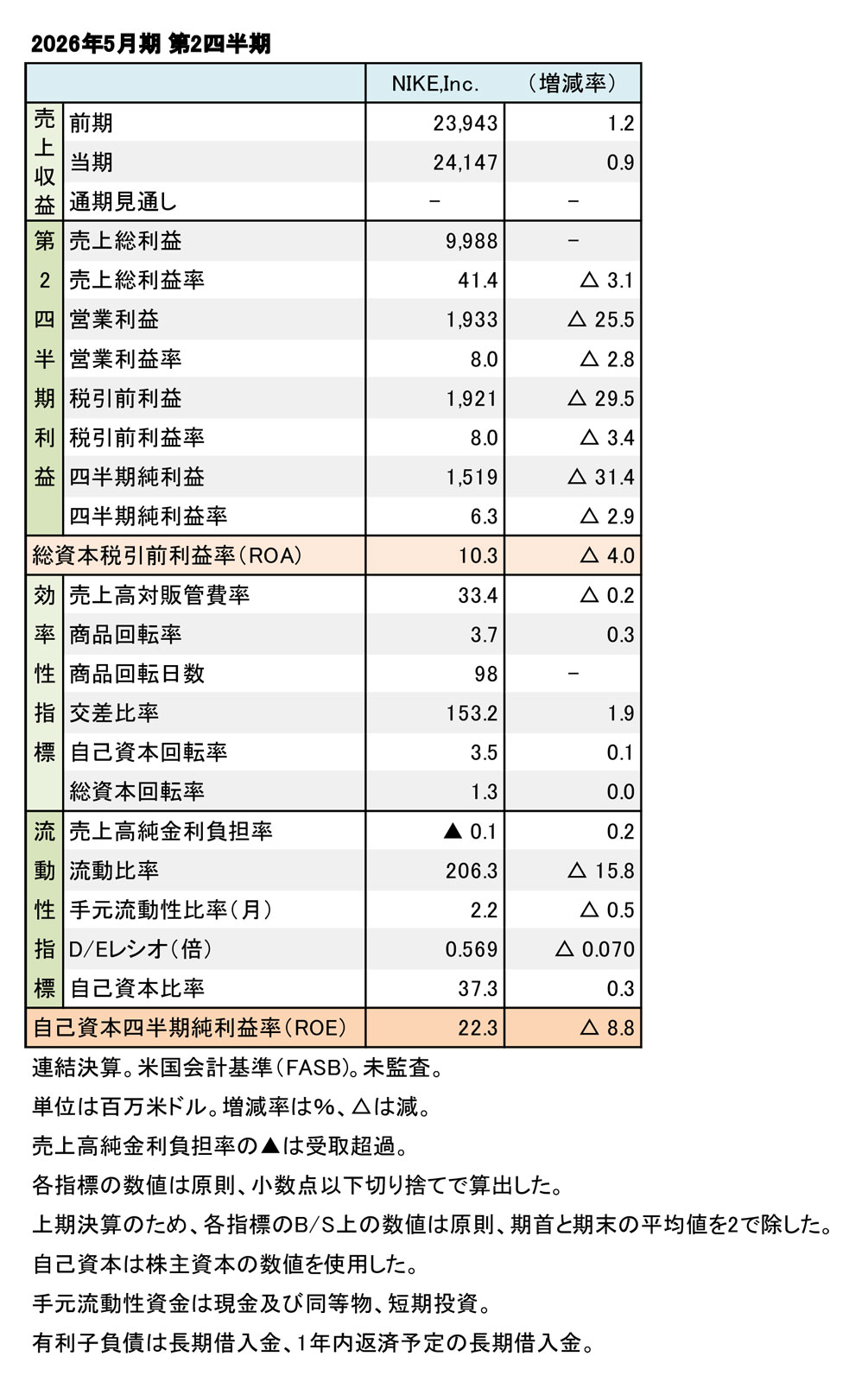 NIKE,Inc. 2026年5月期 第2四半期 連結決算──微増収、減益に