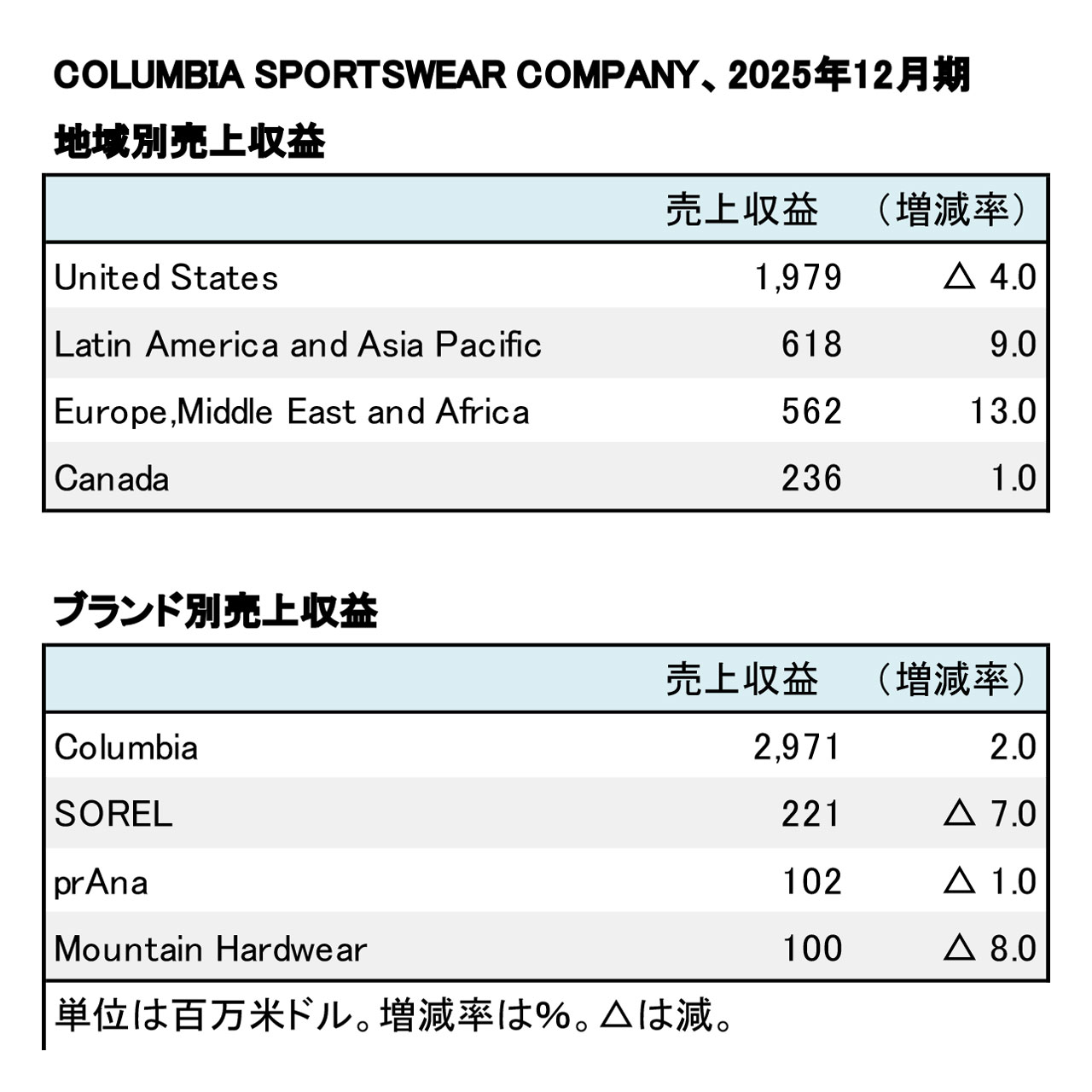 Columbia Sportswear Company(コロンビアスポーツウェア社)の2025年12月期連結決算は、微増収減益となった。主力の「Columbia」(コロンビア)ブランドは堅調だったが、販管費率が増加した。主力市場の「United States」(米国)が前期に続いて苦戦した。