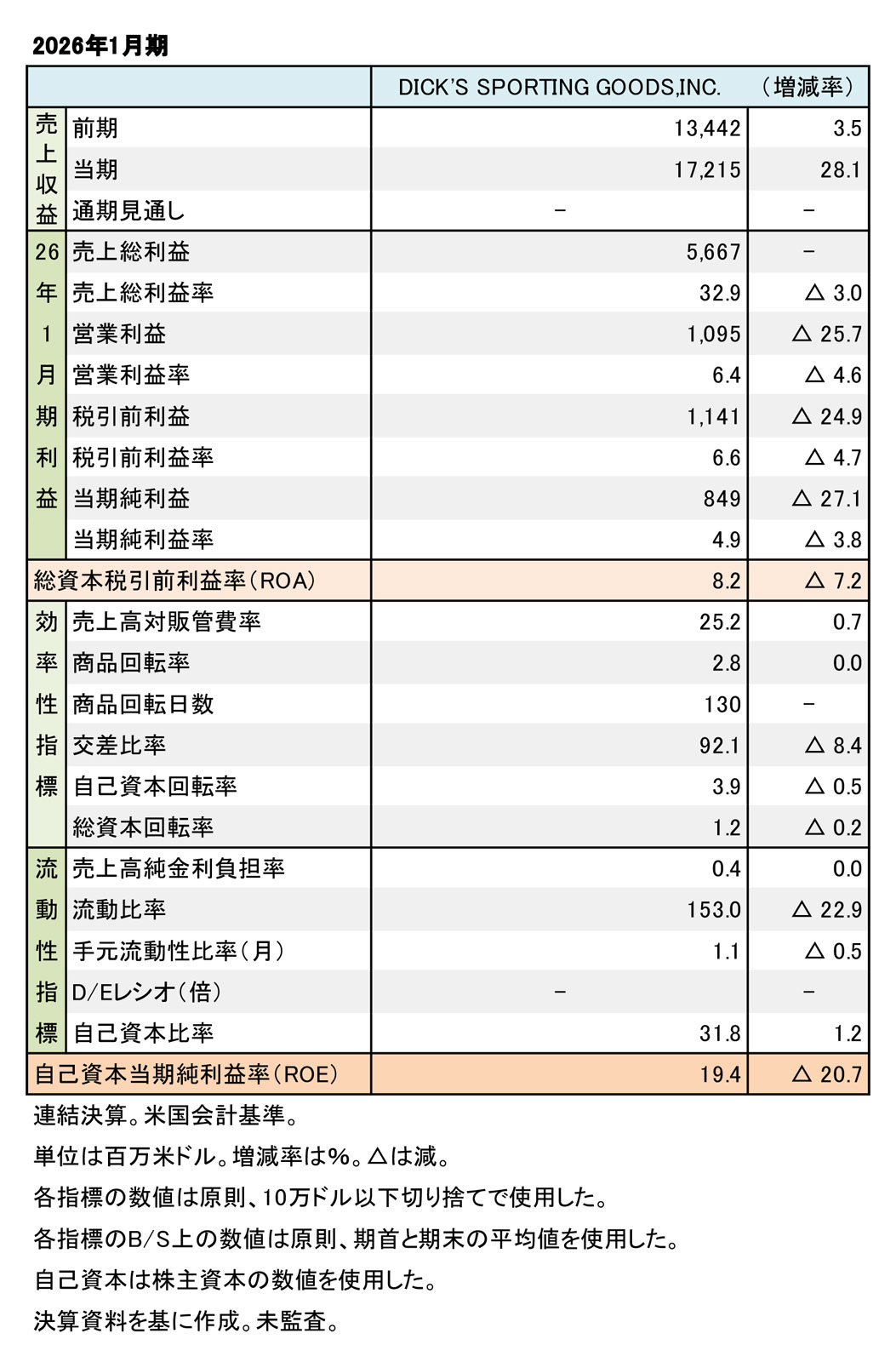 DICK’S Sporting Goods,Inc. 2026年1月期 連結決算──2ケタの増収、利益率減・コスト増で減益に